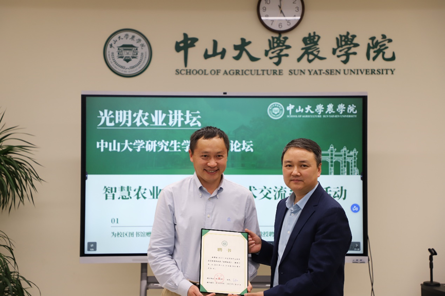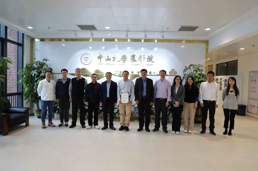 院长肖仕教授为黄文江研究员颁发了中山大学兼职教授聘书,并感谢兰院士、黄老师等专家以学术顾问和兼职教授等身份,尽心尽职为推动中大农学院复办发展所作出的贡献。