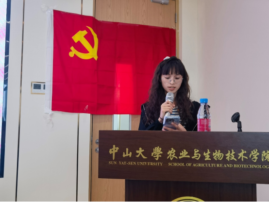 首先,2021级本科生党员龙薇同学分享了参加党日活动的体会。她表示,红色基因不仅是我们的历史,更是我们奋斗的动力。我们要继承先辈的革命精神,将其融入学术研究和日常行为中,努力成为对社会有贡献的人。老师们的科研工作常遇艰辛与挑战,但同时也充满了希望与成就。希望学弟学弟们和自己一样,从中得到启发、获得力量、立下目标,努力学习,参与科研,为传承红色基因、推动农业现代化贡献自己的力量。