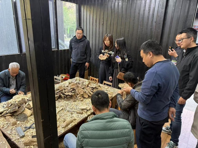 最后,大家一同来到了莞香非遗保护园进行了参观体验。作为农耕文明的一部分,香文化历史悠久、延绵不断。莞香制作是东莞香农世代相传的沉香生产制作传统技艺,在2014年被认定为第四批国家级非物质文化遗产项目。在园区内,大家现场查看了莞香的种植基地,观摩了莞香工人的制香工艺,并体验了由莞香制作的香薰、精油、香茶等文创产品。
