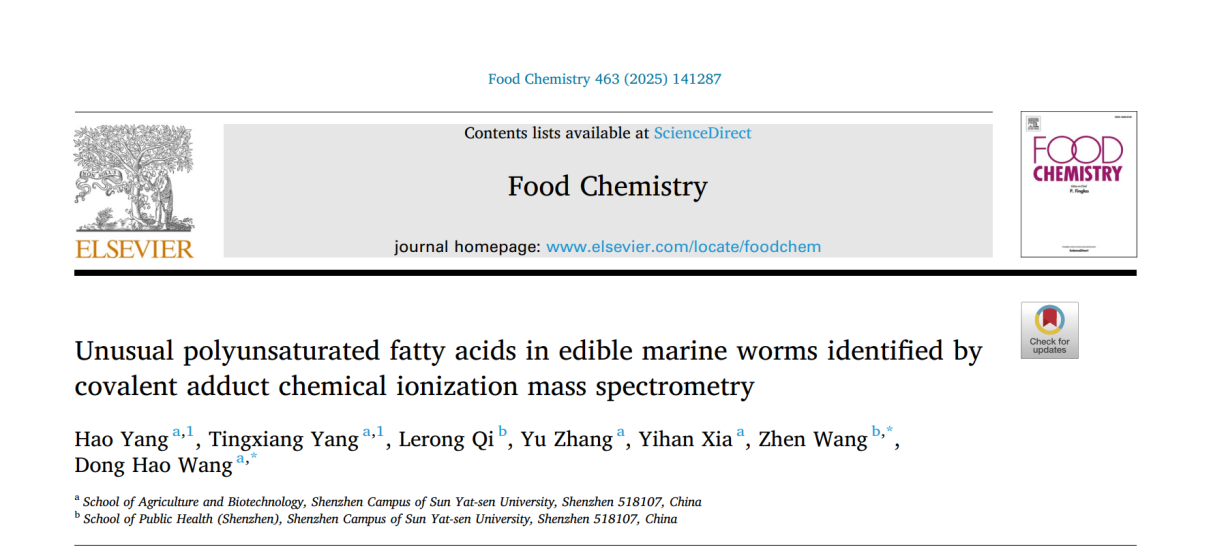 此前,杨浩同学已于 2025 年 1 月以共同第一作者(排序第一)身份,在食品科学领域国际顶级期刊《Food Chemistry》(IF=9.8,中科院大类一区 TOP 期刊)发表相关研究成果,围绕海洋特色生物脂肪酸鉴定与营养挖掘取得重要突破。他还深度参与多项课题研究,相关成果相继在《Journal of Agricultural and Food Chemistry》《Journal of the American Society for Mass Spectrometry》等国际知名期刊发表;在校期间先后主持 2 项大学生创新创业训练计划项目,相关研究得到中山大学大学生创新创业训练计划项目的全力支持。