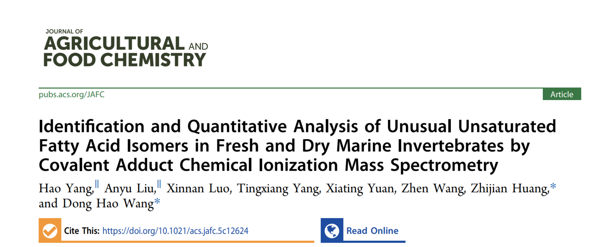 此次发表的题为“Identification and Quantitative Analysis of Unusual Unsaturated Fatty Acid Isomers in Fresh and Dry Marine Invertebrates by Covalent Adduct Chemical Ionization Mass Spectrometry”的研究,于2026年2月正式见刊。研究直面海洋无脊椎动物中多亚甲基间隔脂肪酸异构体难分离、难定量的技术瓶颈,创新性开发了无需标准品或专用色谱柱的GC-CACI-MS/MS定量方法。