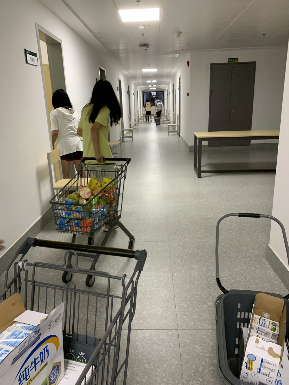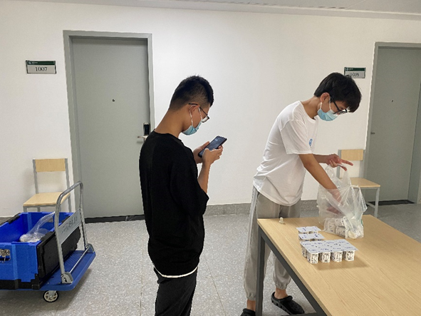 返校前一天,在胡罡副书记的统一安排下,以学生党员、入党积极分子为骨干的在校志愿者们帮助返校的同学往健康观察宿舍运送被褥等个人用品,并为每间宿舍准备牛奶、饼干等临时应急零食。由于大部分同学日间仍有课程,只能牺牲午休和晚课后的时间来完成志愿工作。农学院志愿者们或顶着正午的烈日,或伴着微冷的晚风,拉着运送行李等物资的平板车,往返于宿舍楼与超市之间,为返校同学住得舒心添上最后一道关怀。