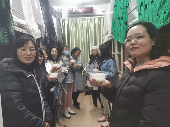 晚上,学院的本科辅导员姜晓谦、魏蜜、陈素玲等老师,带领学生干部走进学生宿舍,在降温的冬日为每位学生送上香甜可口的汤圆。走访中,老师与同学们近距离沟通交流,为同学们解答在学习生活中遇到的困惑,并嘱咐同学们认真学习,调整好心态,劳逸结合,为即将到来的期末考试做好准备。