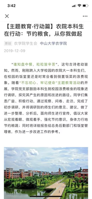 今年8月中旬,农学院又开展了“珍惜每粒粮食”的专题讨论。师生们深刻理解“节约粮食、杜绝浪费”的重要意义,分析目前浪费粮食的主要现象、形成的原因,产生的危害,研讨如何从自身做起,同时带动更多人养成崇农惜粮、文明用餐的良好风尚。
