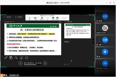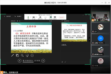 辛国荣副院长为研究生同学介绍了专业学习的相关线上资源,肯定了本硕博联动线上日常网课答疑的成效。在程月华书记、刘兴基老师分别介绍了目前学校、学院对疫情防控工作安排,学生党团班建设近期活动之后,参会同学自由发言,师生互动交流,围绕学院发展和同学们的学习生活,特别是如何进一步培养同学们的自律意识、提高班团干部的组织能力、密切同学们居家的交流互助积极建言。