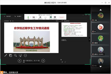 在学校首批学生返校之际,农学院为了防止同学们思想情绪产生波动,同时进一步了解同学们居家学习和防疫生活中所遇到的问题和困难, 5月9日全天,采取“老师现场集中+学生居家视频”的形式,本科生以班级为单位,研究生以年级为单位,分别进行了三场线上恳谈会,学院党政领导、青年教师专职辅导员、党政辅导员等共同参加。