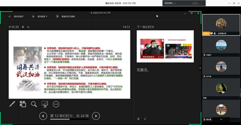 在研究生班会上,学院还邀请本科生班团干部和入党积极分子一同参加,首先由程书记做了题为“从疫情防控看中国之治”的线上思政讲座。