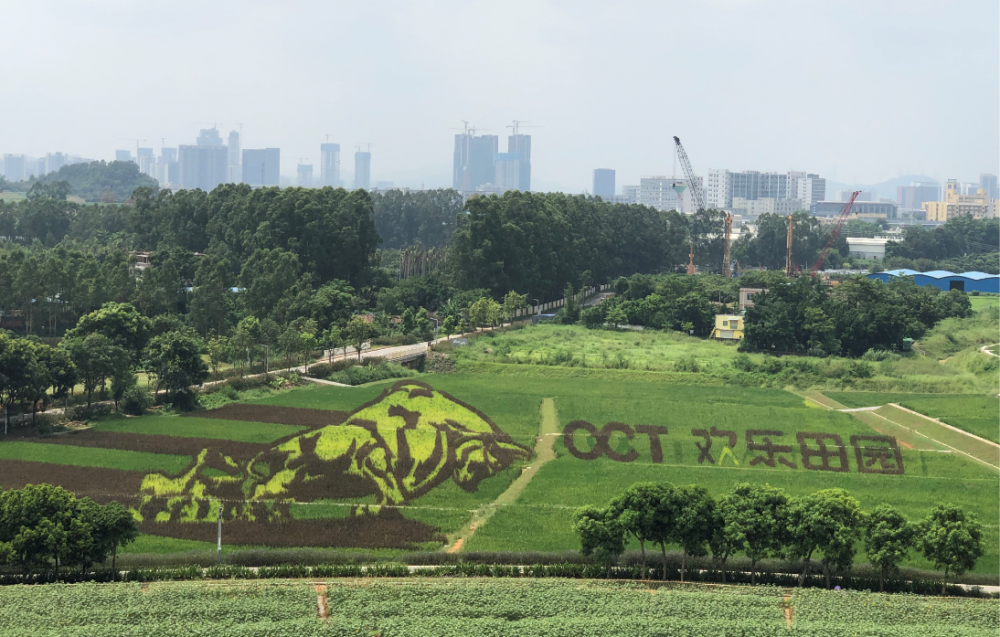 活动第一站——光明生态小镇。作为光明生态小镇农业板块(欢乐田园)运营主体的华侨城光明(深圳)现代农业有限公司的牛月景经理等,热情接待了带队前往的谭金芳院长、胡罡主任和同学们。师生实地了解了距校区约3公里的生态小镇的整体规划,参观了多种观光作物、花卉,并登上观光塔欣赏了别具特色的彩稻图案。在谭院长和牛经理的讲解下,同学们了解到:彩稻不仅具有经济价值、观光价值,还具有浓厚的当地文化气息。利用彩稻设计出的“来了就是深圳人”的字样,以及拓荒牛、雄鹰等图案,无一不在为深圳代言,无一不是对深圳的美好祝愿。谭院长鼓励同学们能够利用所学知识,分析光明小镇中尚待解决的病虫害、土壤改良等农业问题,为推动新农科的发展蓄积力量。