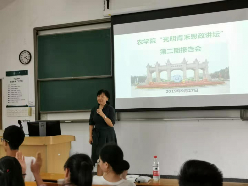 9月初以来,农学院为有针对性地强化学生思政工作,开设了每周一期的“光明青禾思政讲坛”。为配合主题活动的开展,直属党支部程月华副书记在三期思政讲坛上分别做了“爱党爱国,知农报国 ——中大的传统与我们的责任 ”、“中国革命道路的探索与中国共产党人的初心”、“如何成为一名共产党员——发展党员工作实务”等讲座,并组织收看了王磊教授、富明慧教授等身边先进党员的感人事迹。