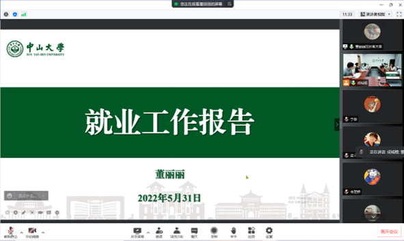 接着,学校学工部董丽丽副处长从就业工作总体情况、就业形势和2022届毕业生就业情况、职业发展指导资源三个方面,做了学校就业工作指导报告,详尽地讲述近年来国内的就业环境与结构、中大毕业生的就业结构特点和未成功就业同学所遇的困难等内容。她表示,目前“就业难”与“招人难”两种现象并存,前者难在部分未就业同学尝试应聘受挫后就消极“躺平”;后者难在很多地市以及基层的机关、企事业单位求贤若渴,但是部分毕业生未能正确研判个人条件与用人市场的对接,报名的同学却很少。导致人力资源匹配的错位现象,有部分原因是同学们求职的眼界不高和主动性不够。她指出,学校始终在尽可能地创造就业的机会,在疫情防控政策允许的范围内,展开线下、线上招聘会,尤其是中大校招等公众号和学校就业网等官网会及时公布招聘信息,建议同学们要密切关注动态、积极主动尝试应聘。只要学校、学院、学生、校友共同努力、密切配合,毕业生就业前景还是积极向好的。