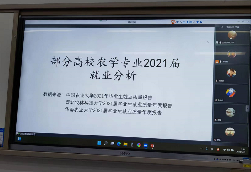 助理辅导员王健针对部分涉农高校2021届就业形势进行了交流分享,对中国农业大学、华南农业大学、西北农林科技大学等高校毕业就业率、行业和地区分布等情况进行了调研分析,为参会同学做职业规划和应聘求职总体供参考。