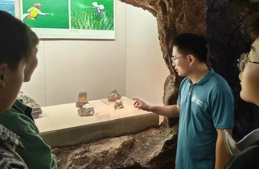 同学们首先来到了“广东省自然资源”展馆,其中共有地质地貌、矿产、宝玉石、中草药、陆生野生动物、海洋生物、古生物等7个主题展览。在地质地貌展区,黄越泓老师向同学们介绍了广东农业的起源与发展,以及广东发展农业得天独厚的地理优势。