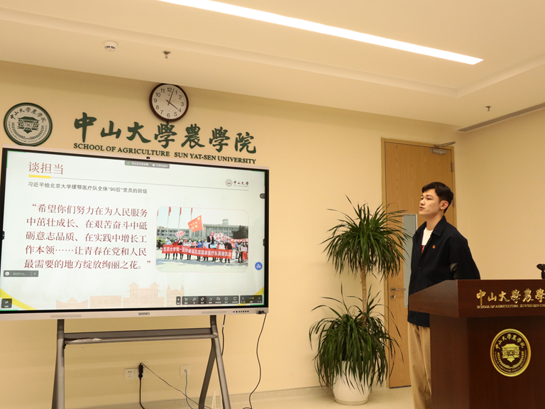 首先,王梓杰同学做了“习总书记给青年的回信”的主题学习分享,从新时代青年理想、担当、爱国、奋斗和成长五个方面,宣讲了习近平总书记近年来给青年们的回信精神,激励与会同学们把握好青春时光,将个人发展与国家发展结合起来,在实践中磨砺自己,为建设新时代中国而接继奋斗。他引用习总书记的话说:“奋斗不只是响亮的口号,而是要在做好每一件小事、完成每一项任务、履行每一项职责中见精神……强者,总是从挫折中不断奋起、永不气馁。”