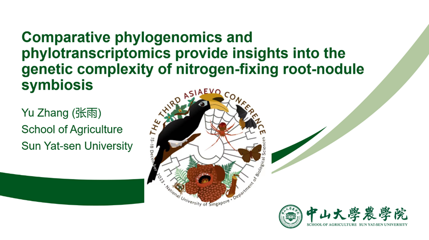 12月16-18日,第三届亚洲演化生物学大会在新加坡国立大学举行,我院张雨副教授应邀参会,并以“Comparative phylogenomics and phylotranscriptomics provide insights into the genetic complexity of nitrogen-fixing root-nodule symbiosis”为题做了学术报告。