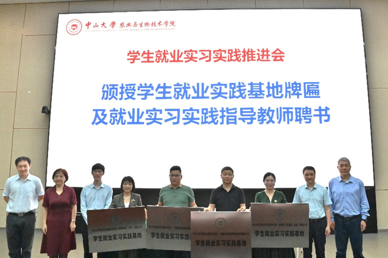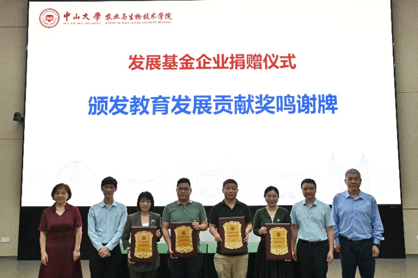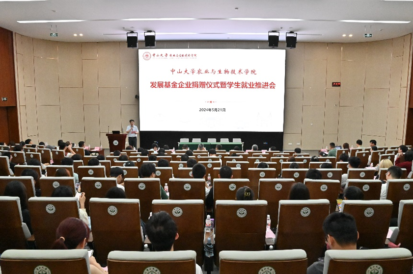 在中山大学世纪华诞即将到来之际,为进一步推动学院高质量发展和助力学生成长,5月21日上午,农业与生物技术学院在深圳校区西教学楼讲学厅举办了发展基金企业捐赠仪式暨学生就业推进会。捐赠学院发展基金的深圳市丰农控股集团、广东瑞丰生态环境科技股份有限公司、深圳市中佳生物医疗科技有限公司、碳原科技(云浮)有限公司等四家合作企业负责人,学校教育发展与校友事务办公室林炜双副主任,学院党政领导班子、教师代表,以及本科生和研究生140多人参加大会。会议由学院党委副书记胡罡主持。